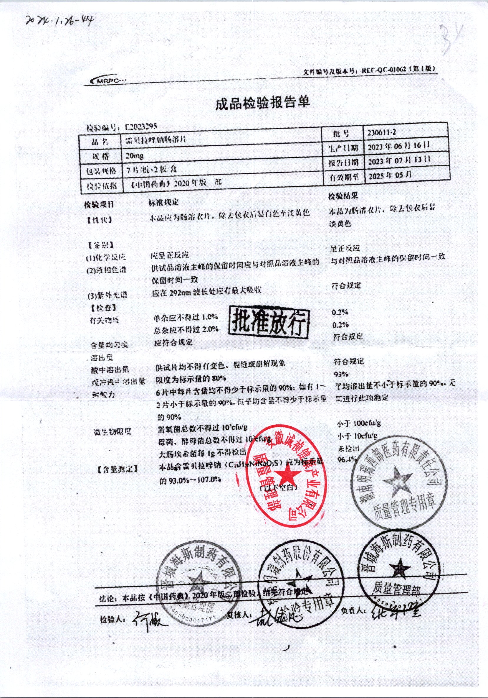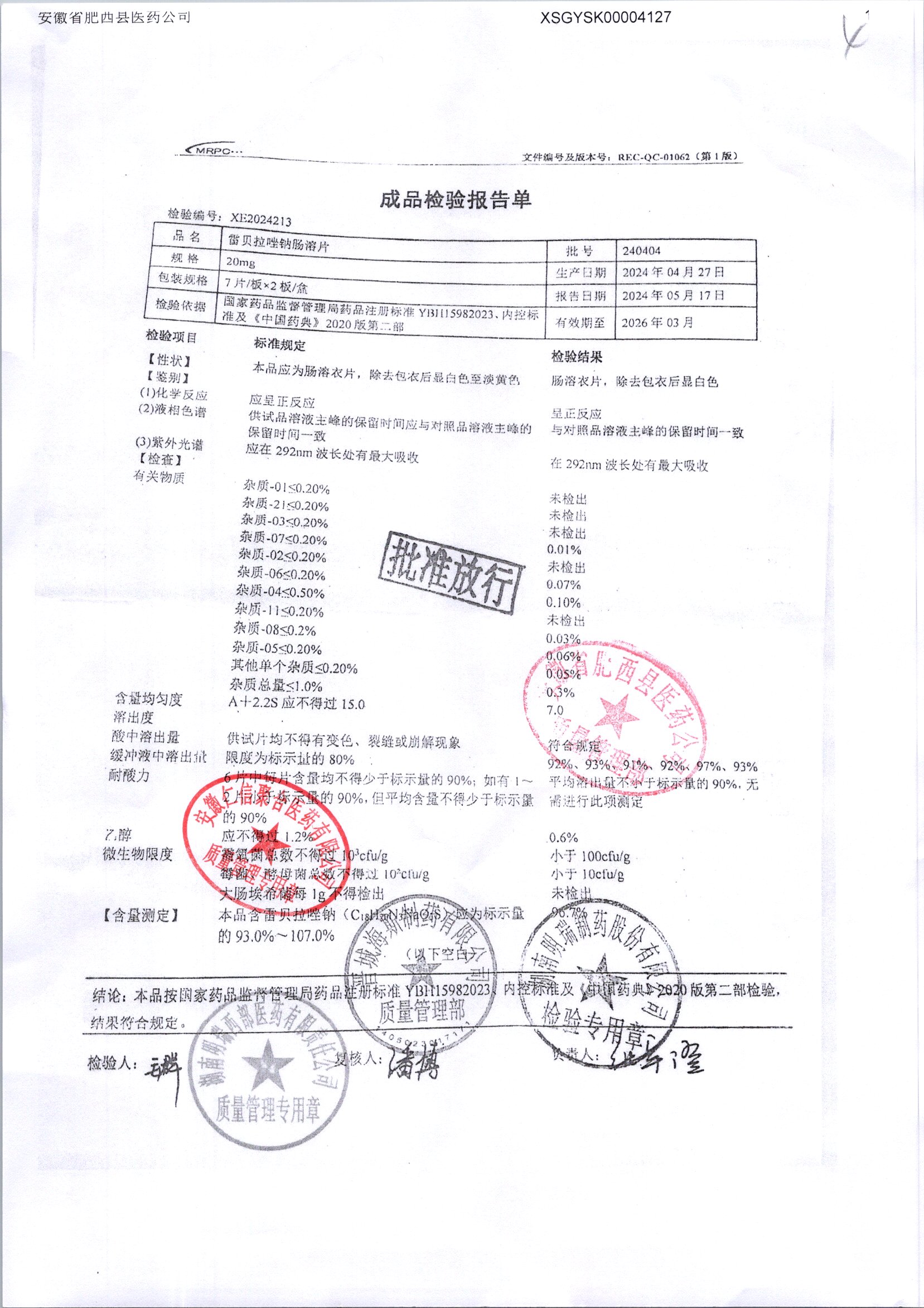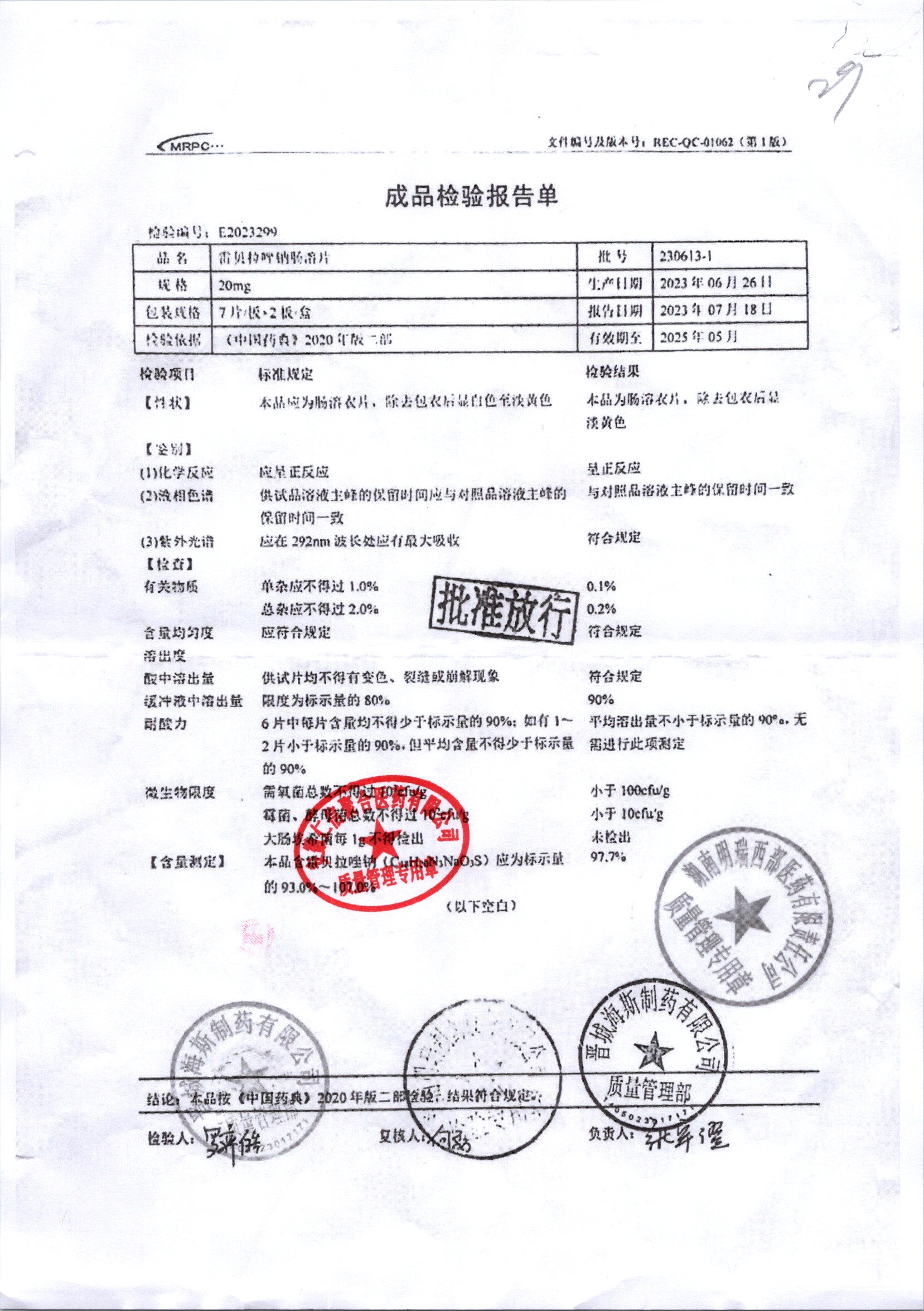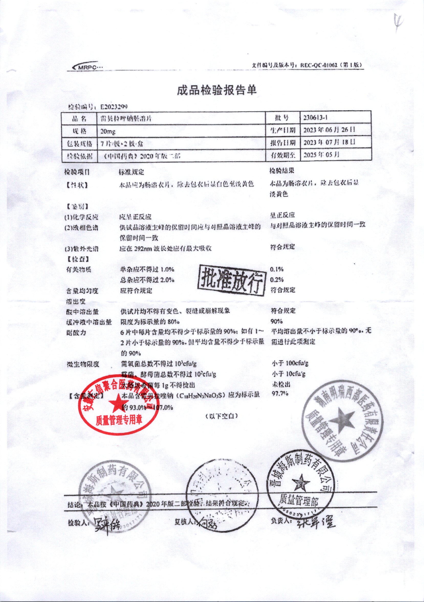 | 雷貝拉唑鈉腸溶片 | 20mg*14片 | 20210503 | 查看詳情 |