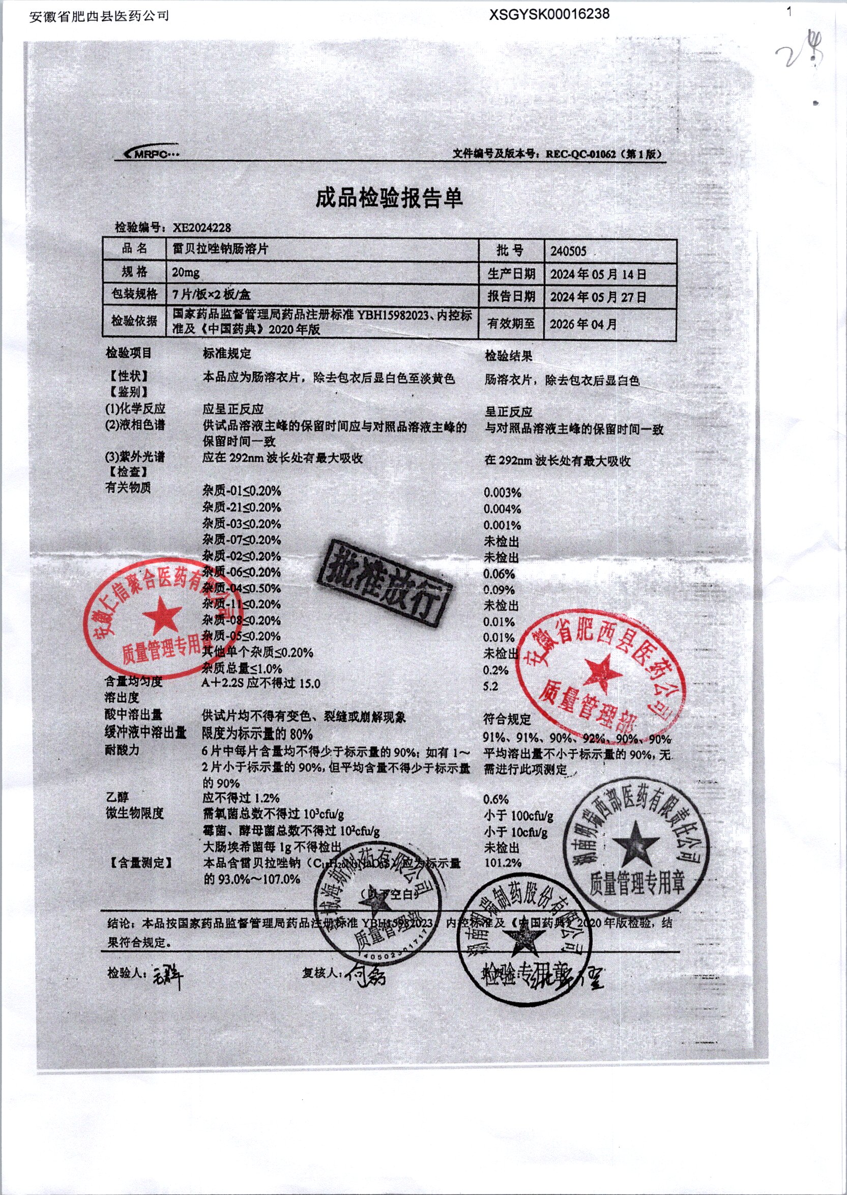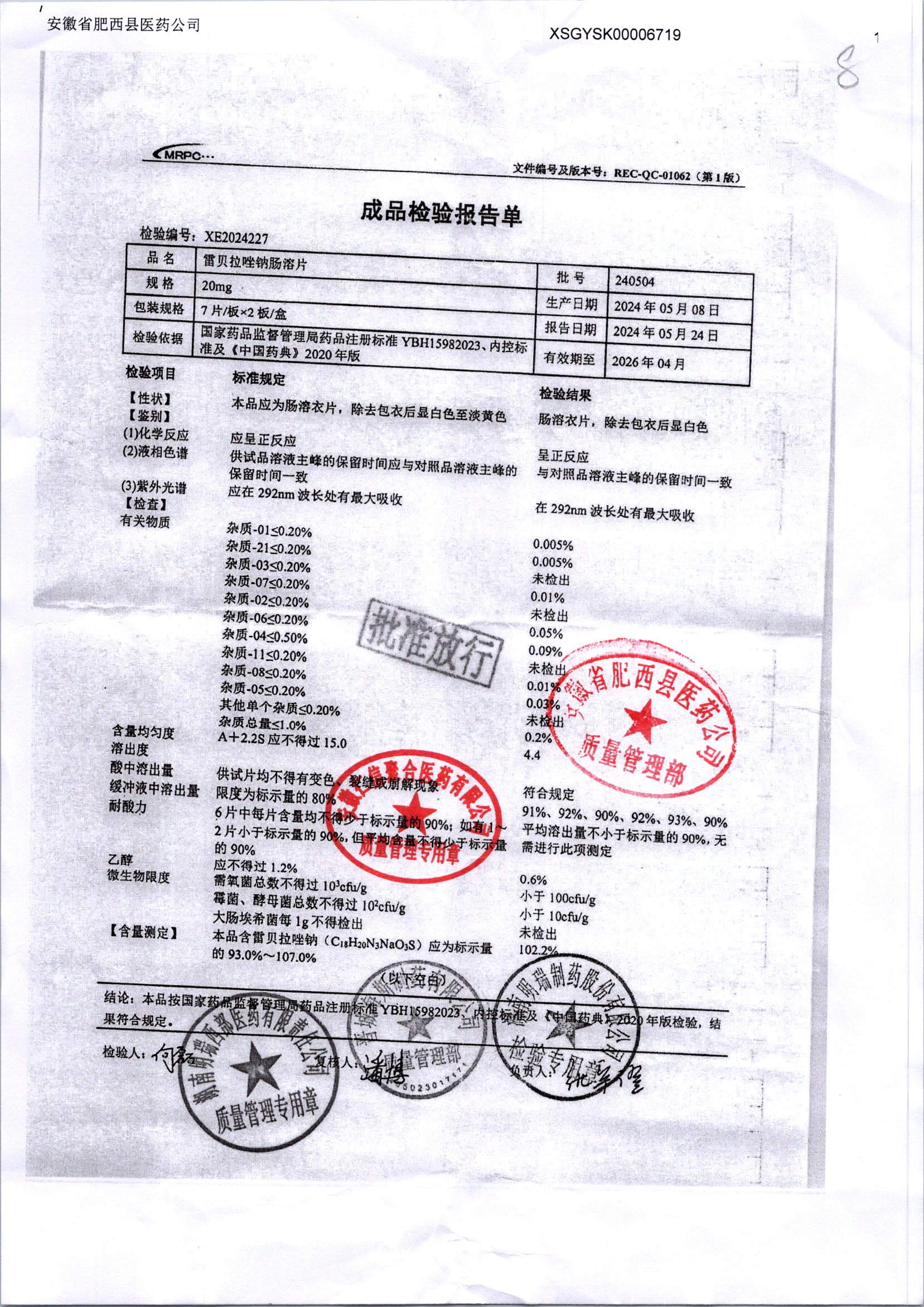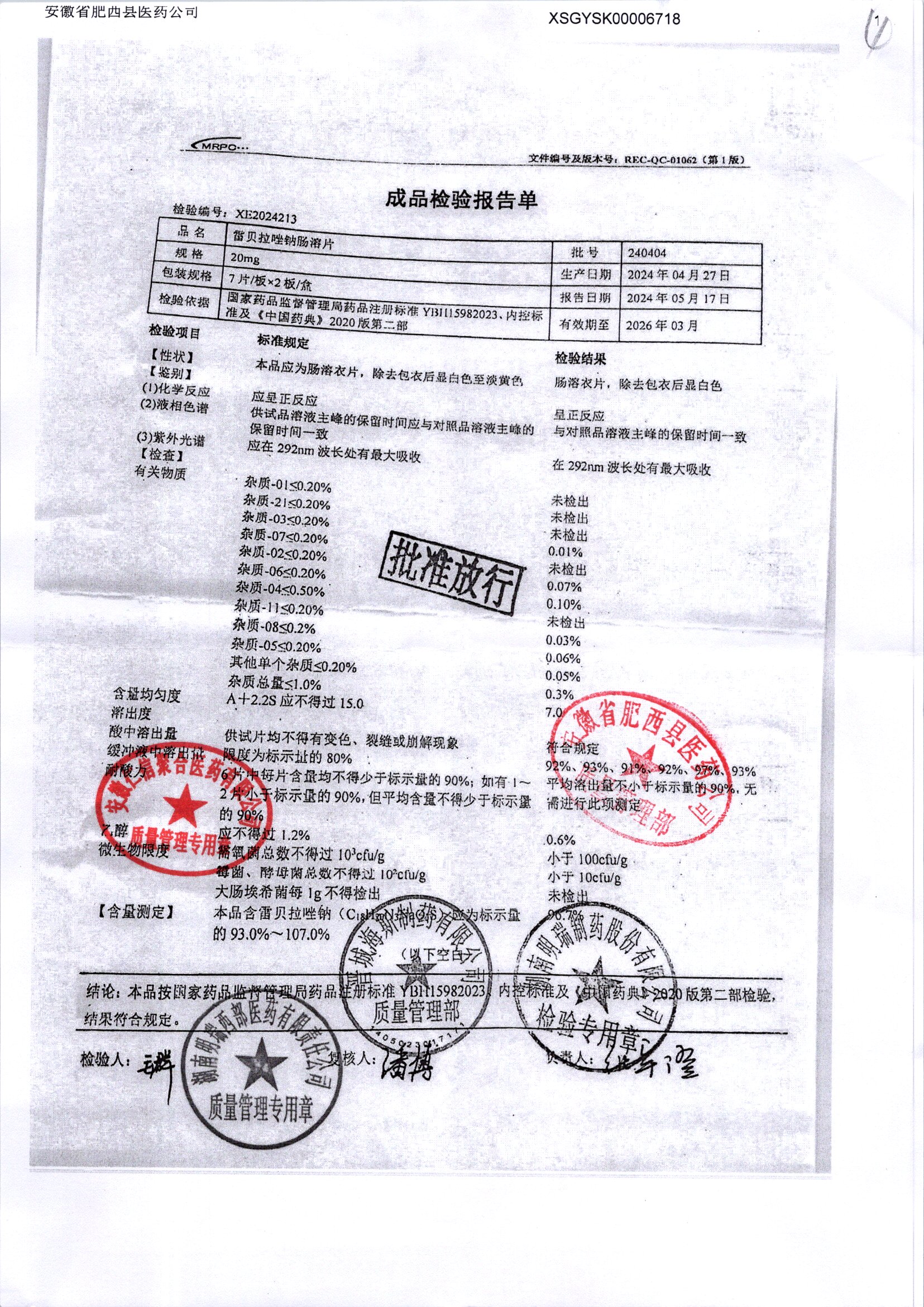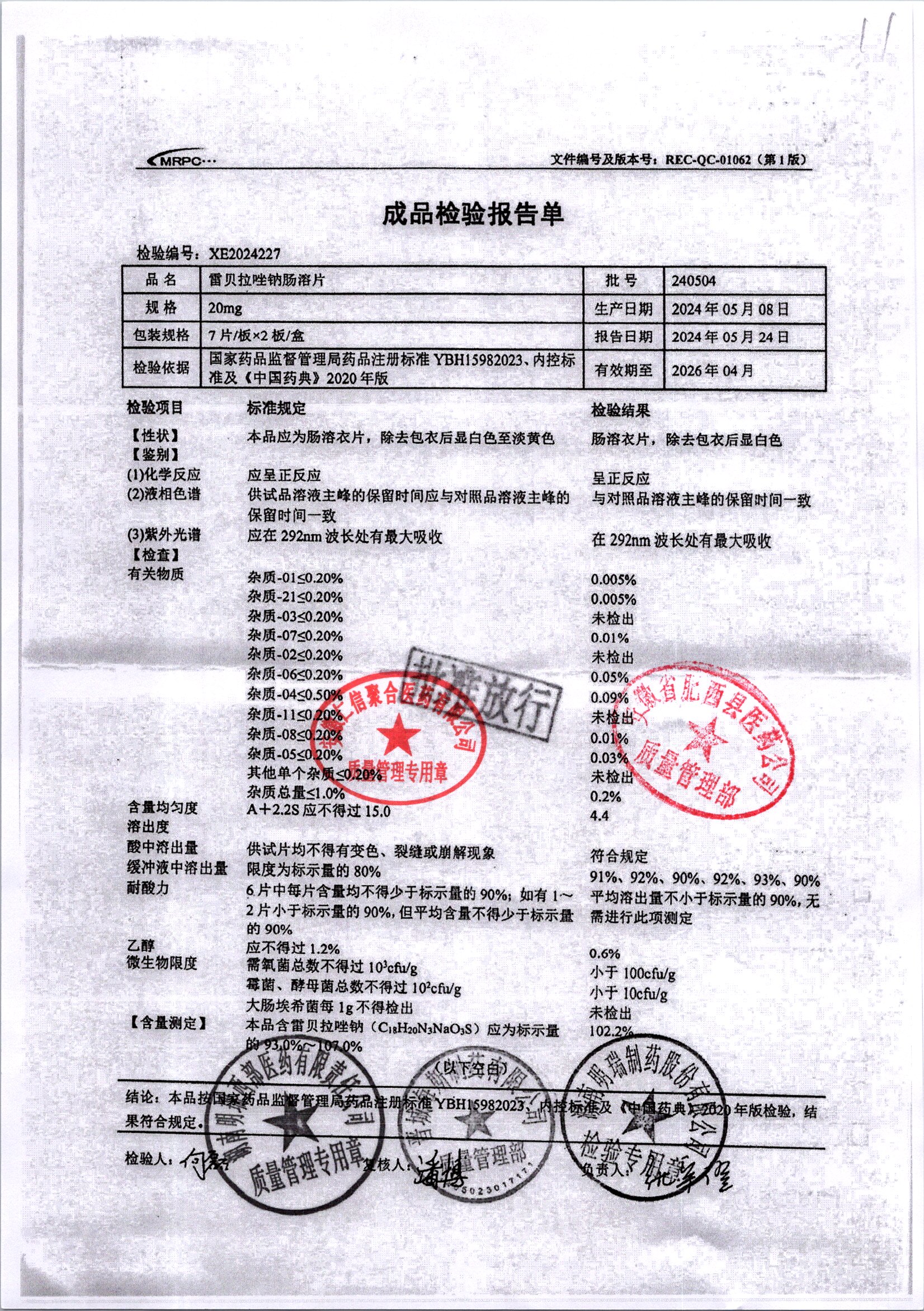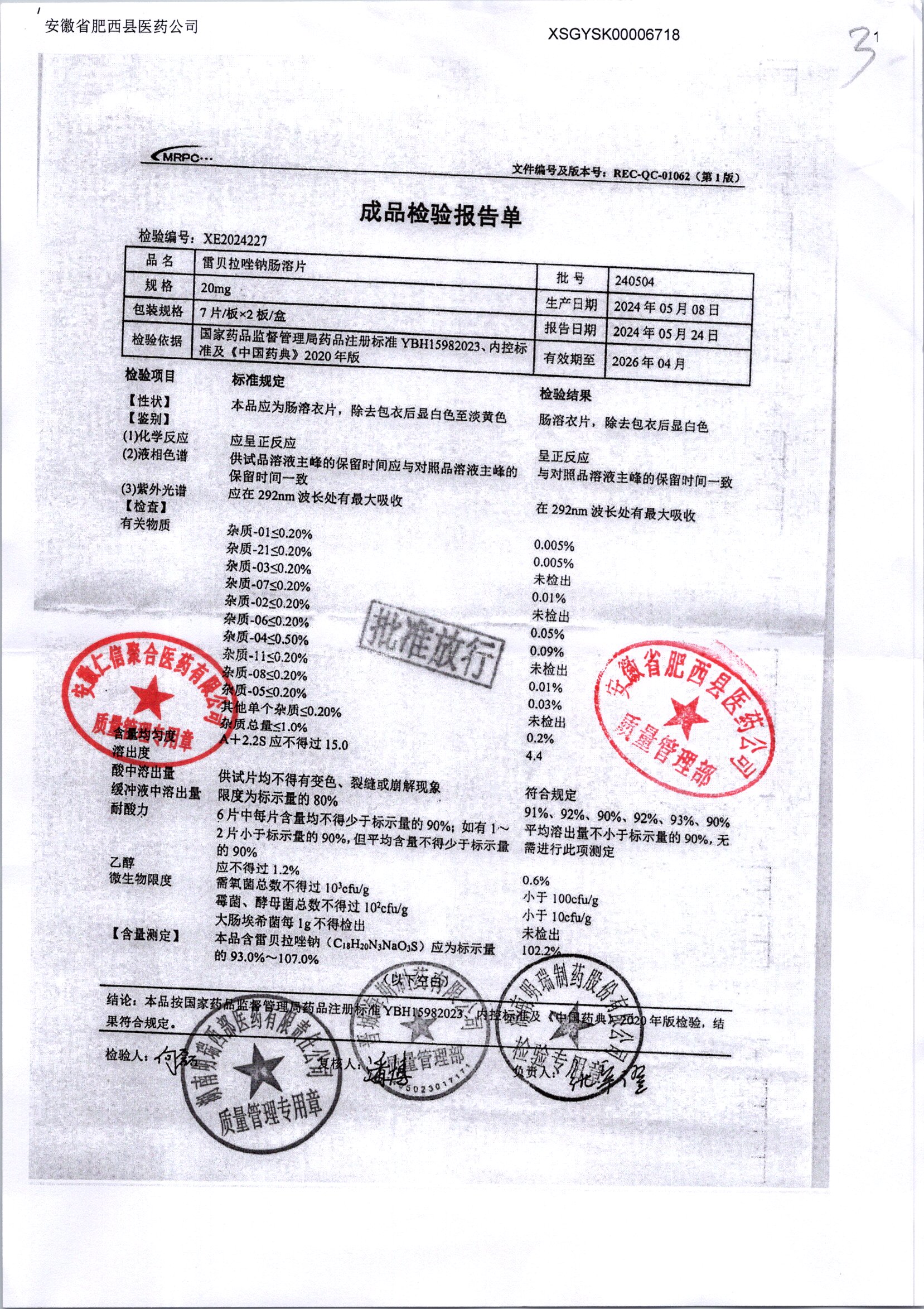 | 雷貝拉唑鈉腸溶片 | 20mg*14片 | 20210503 | 查看詳情 |