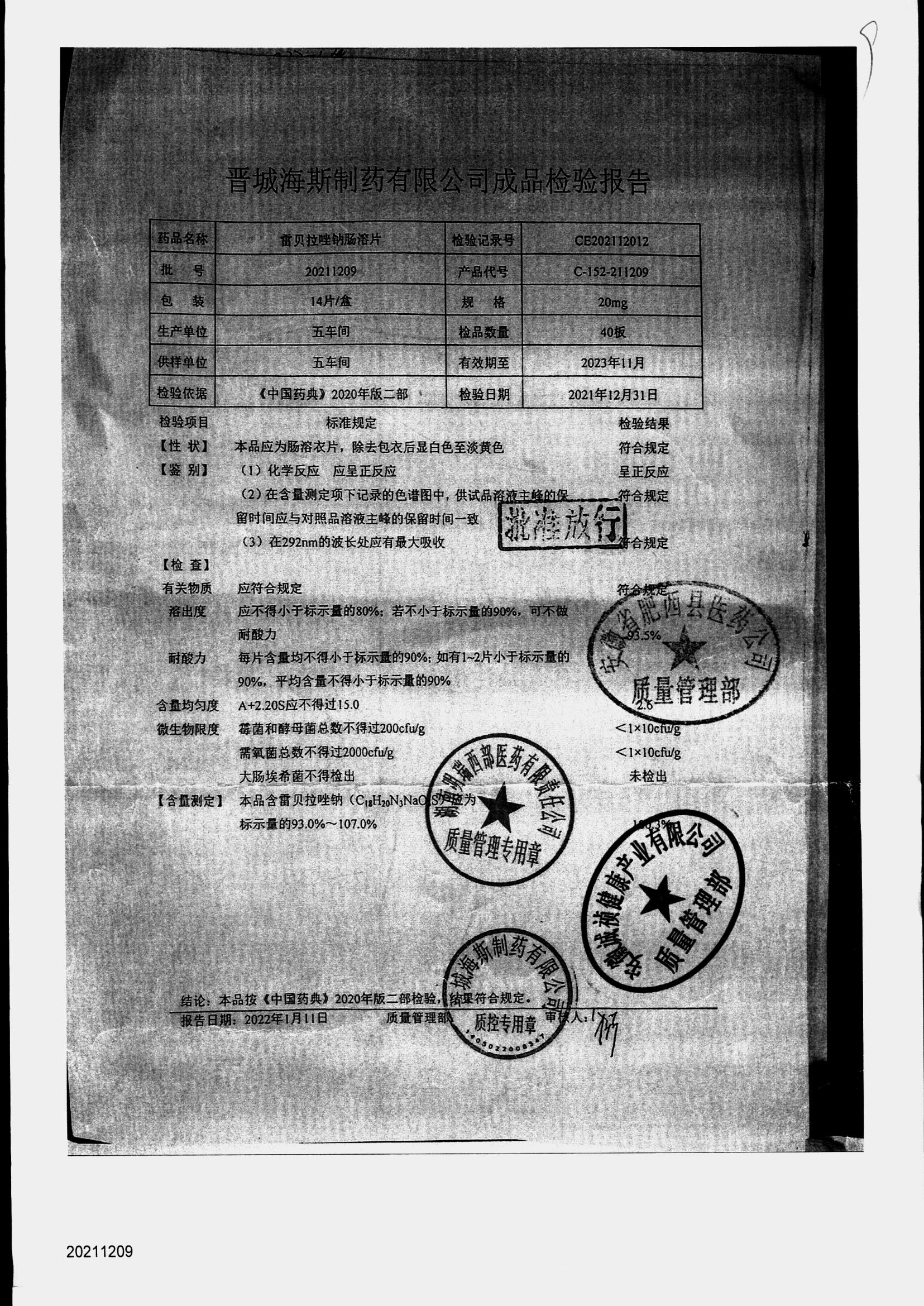 | 雷貝拉唑鈉腸溶片 | 20mg*14片 | 20211209 | 查看詳情 |