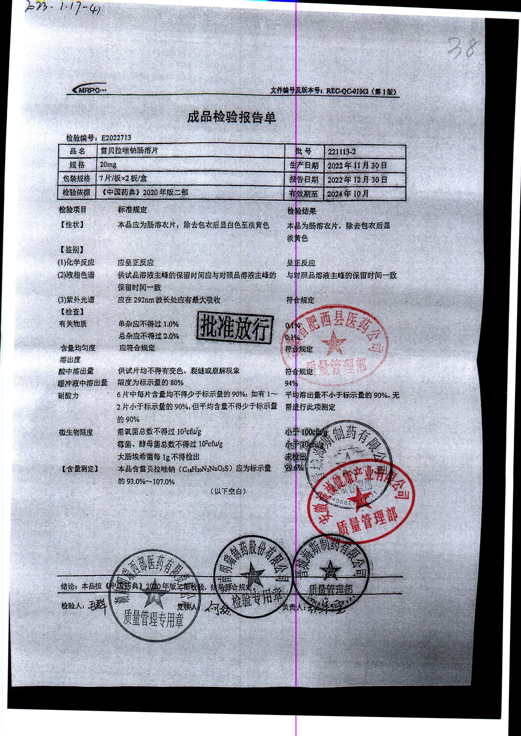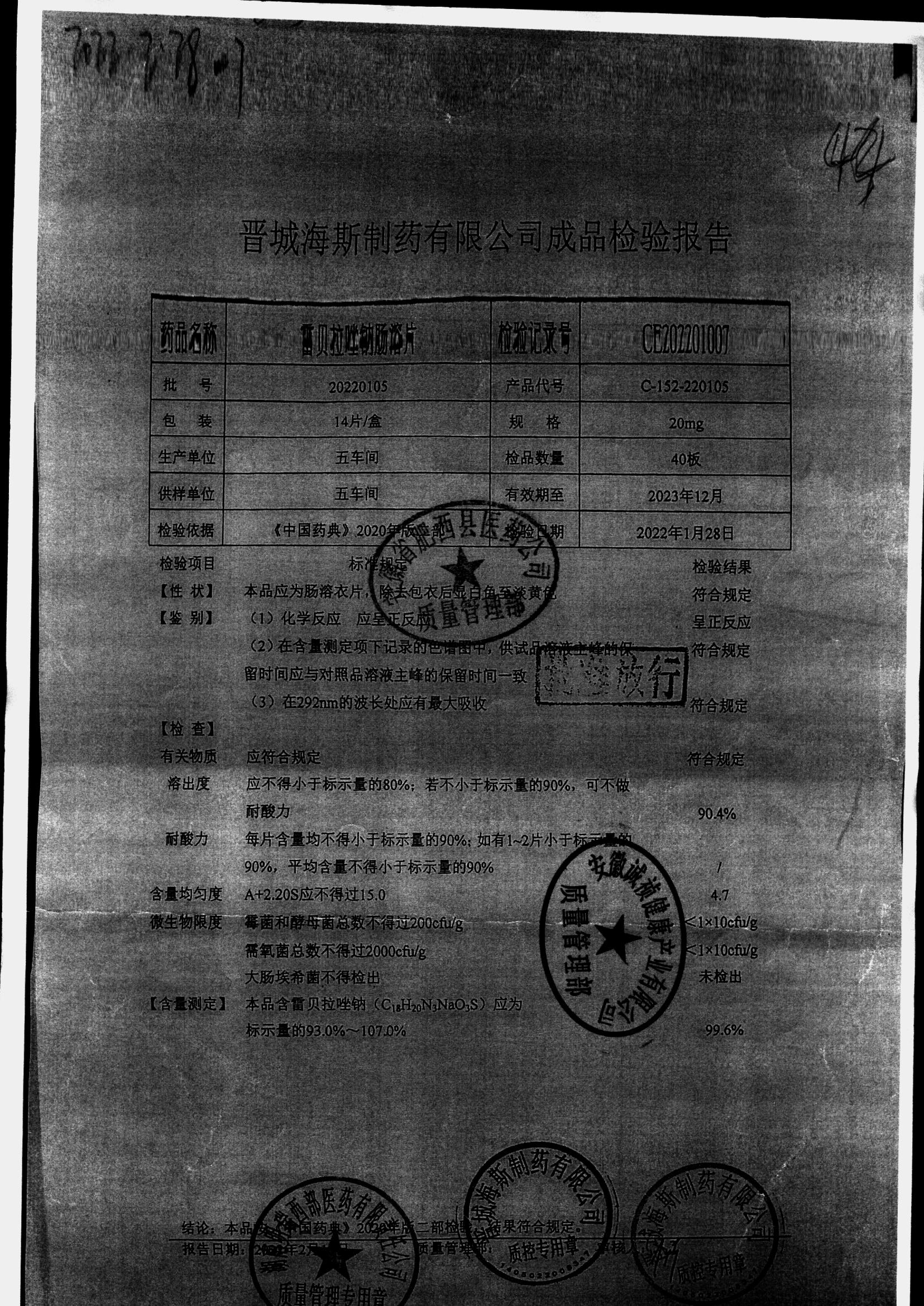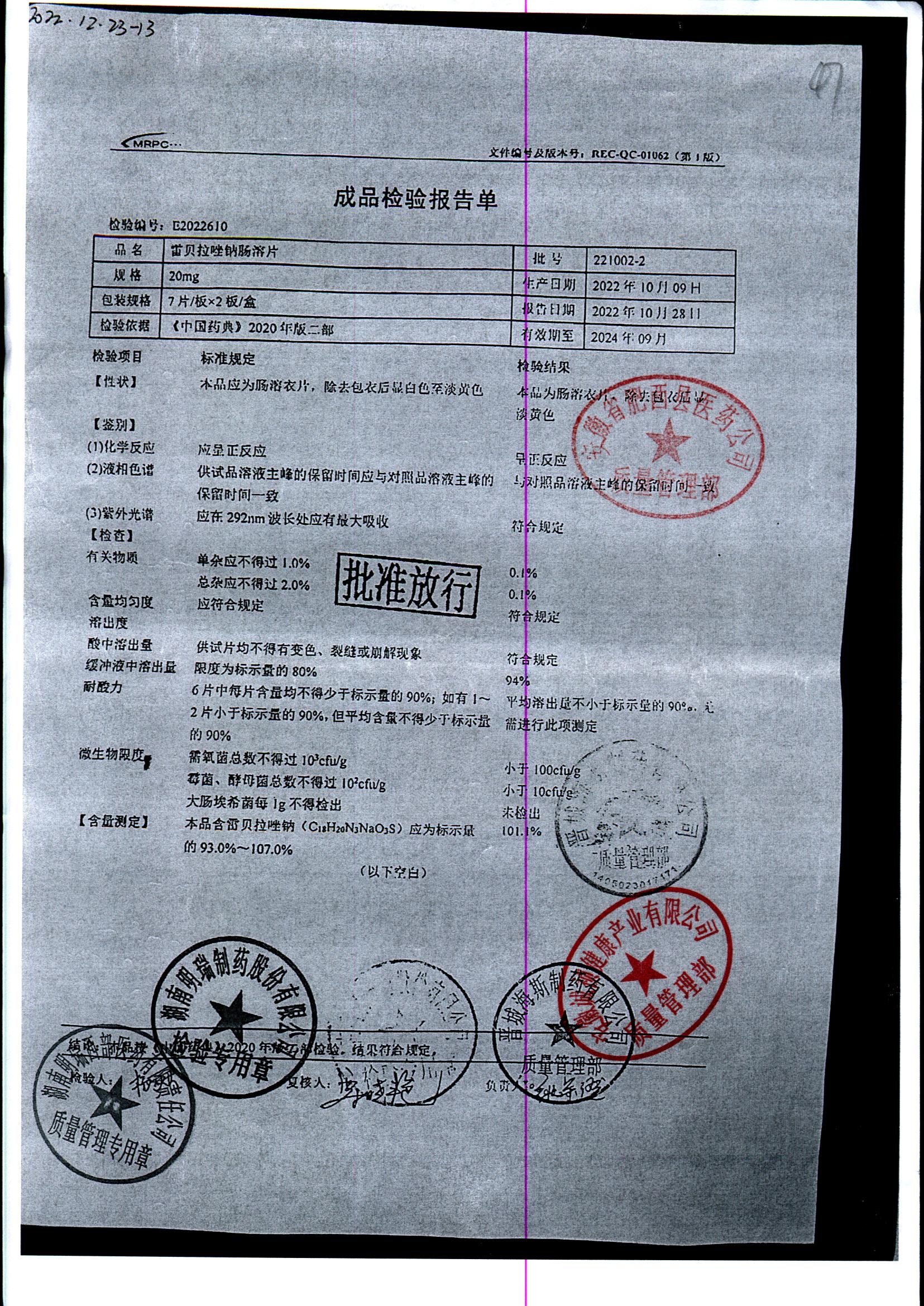 | 雷貝拉唑鈉腸溶片 | 20mg*14片 | 20220105 | 查看詳情 |