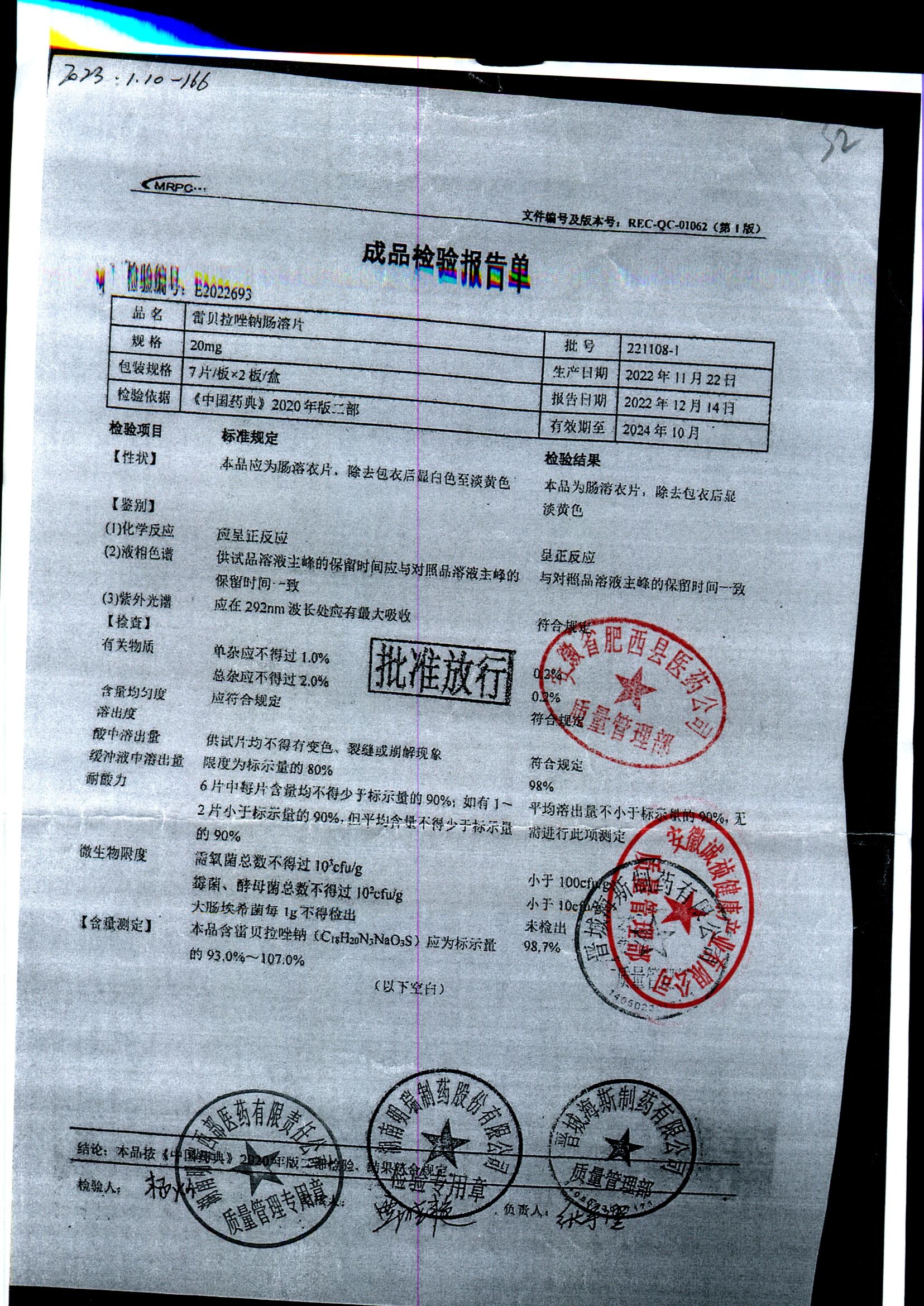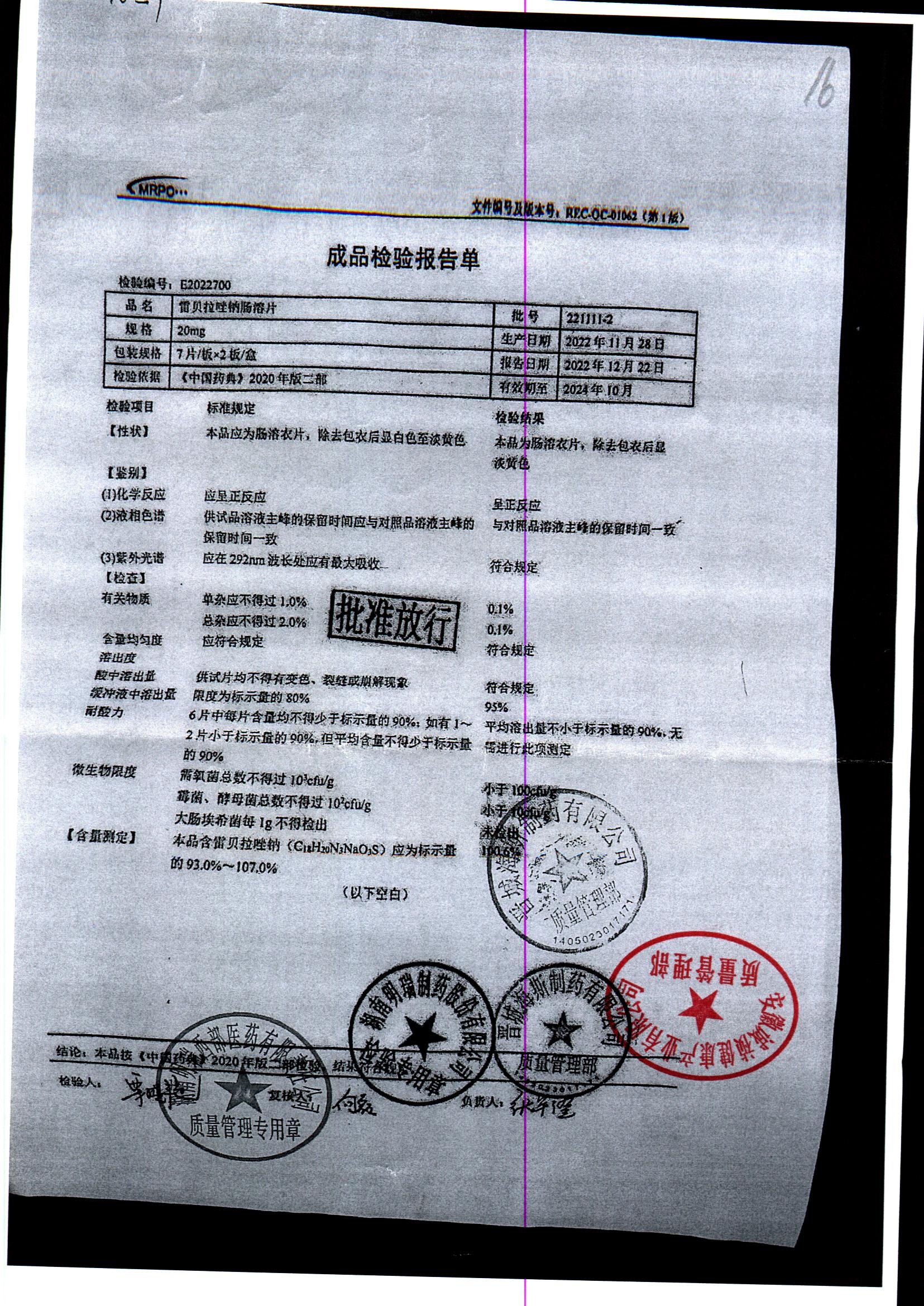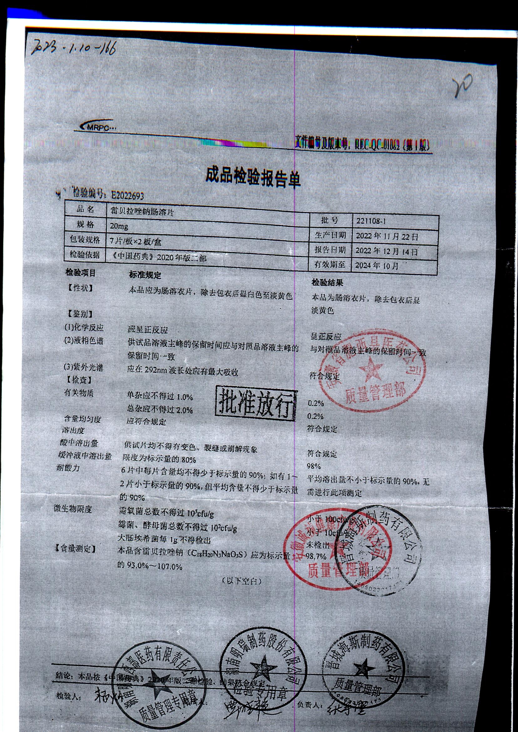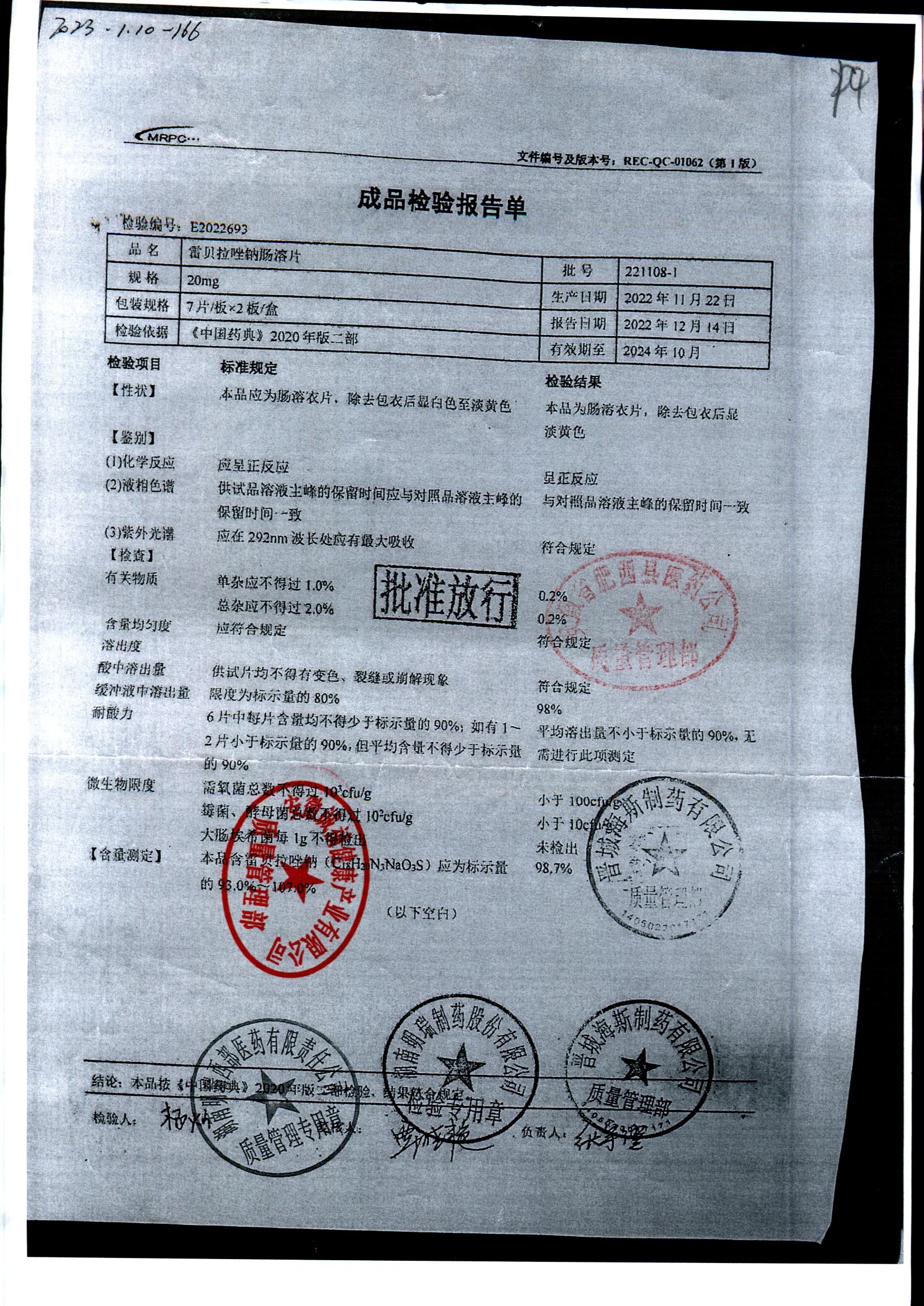 | 雷貝拉唑鈉腸溶片 | 20mg*14片 | 20220211 | 查看詳情 |
