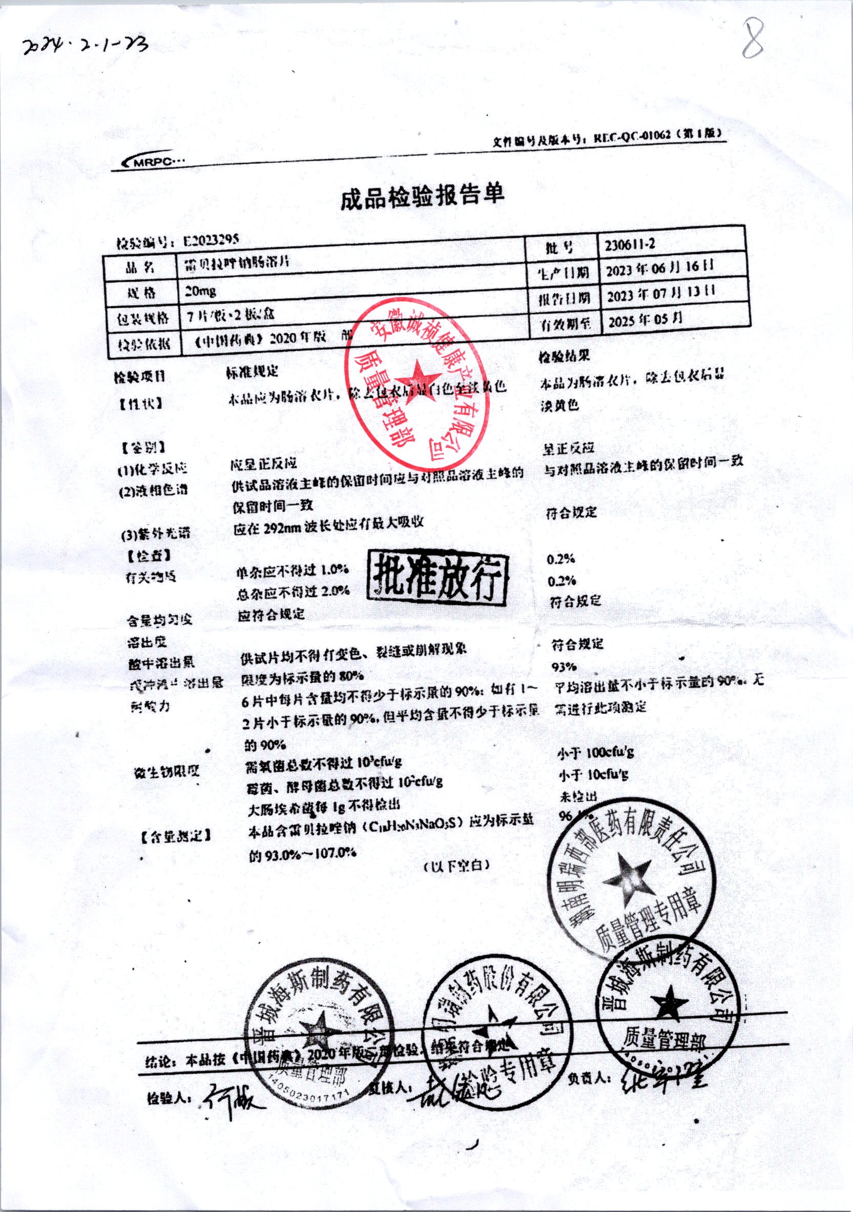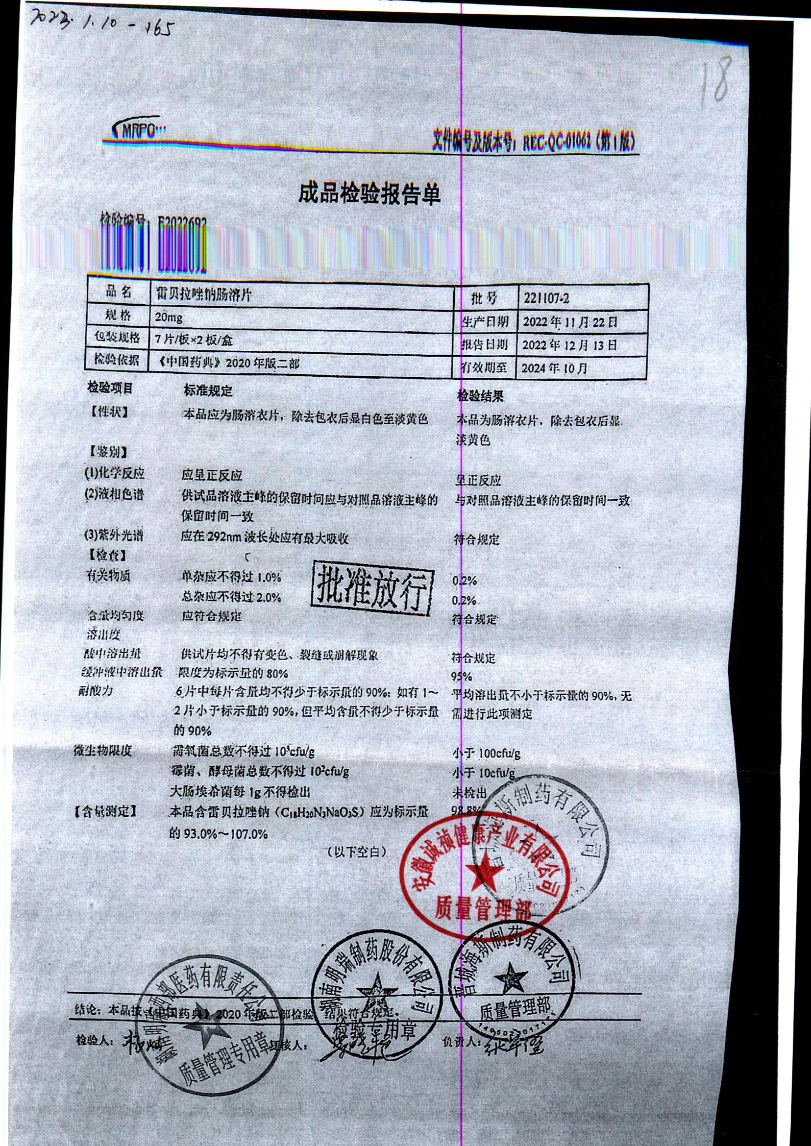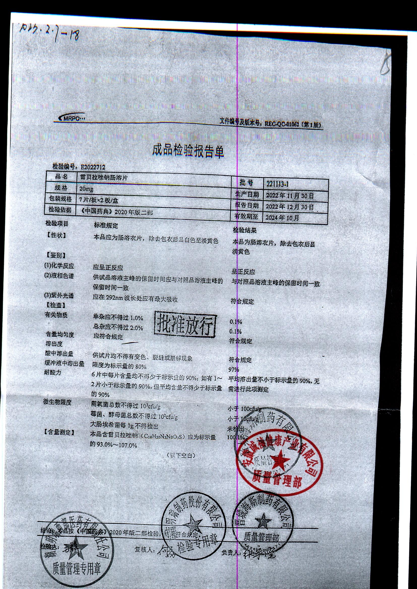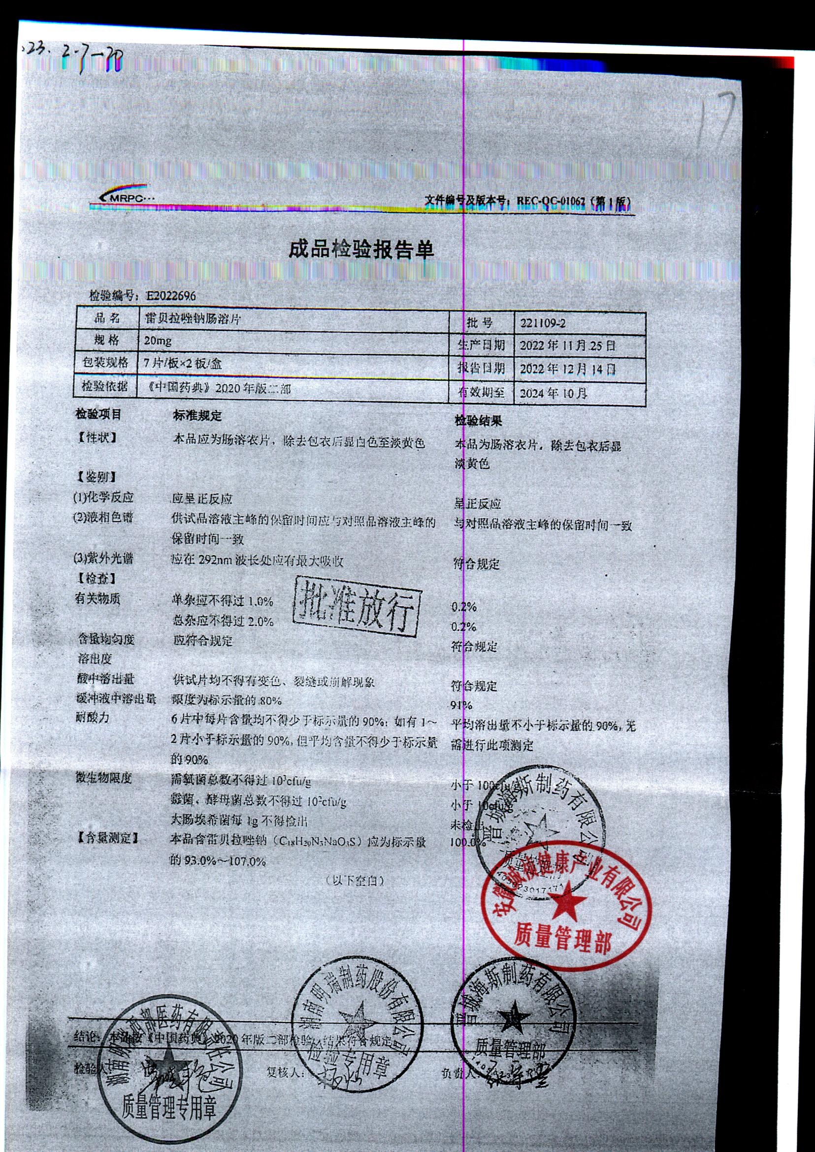 | 雷貝拉唑鈉腸溶片 | 20mg*14片 | 20220211 | 查看詳情 |