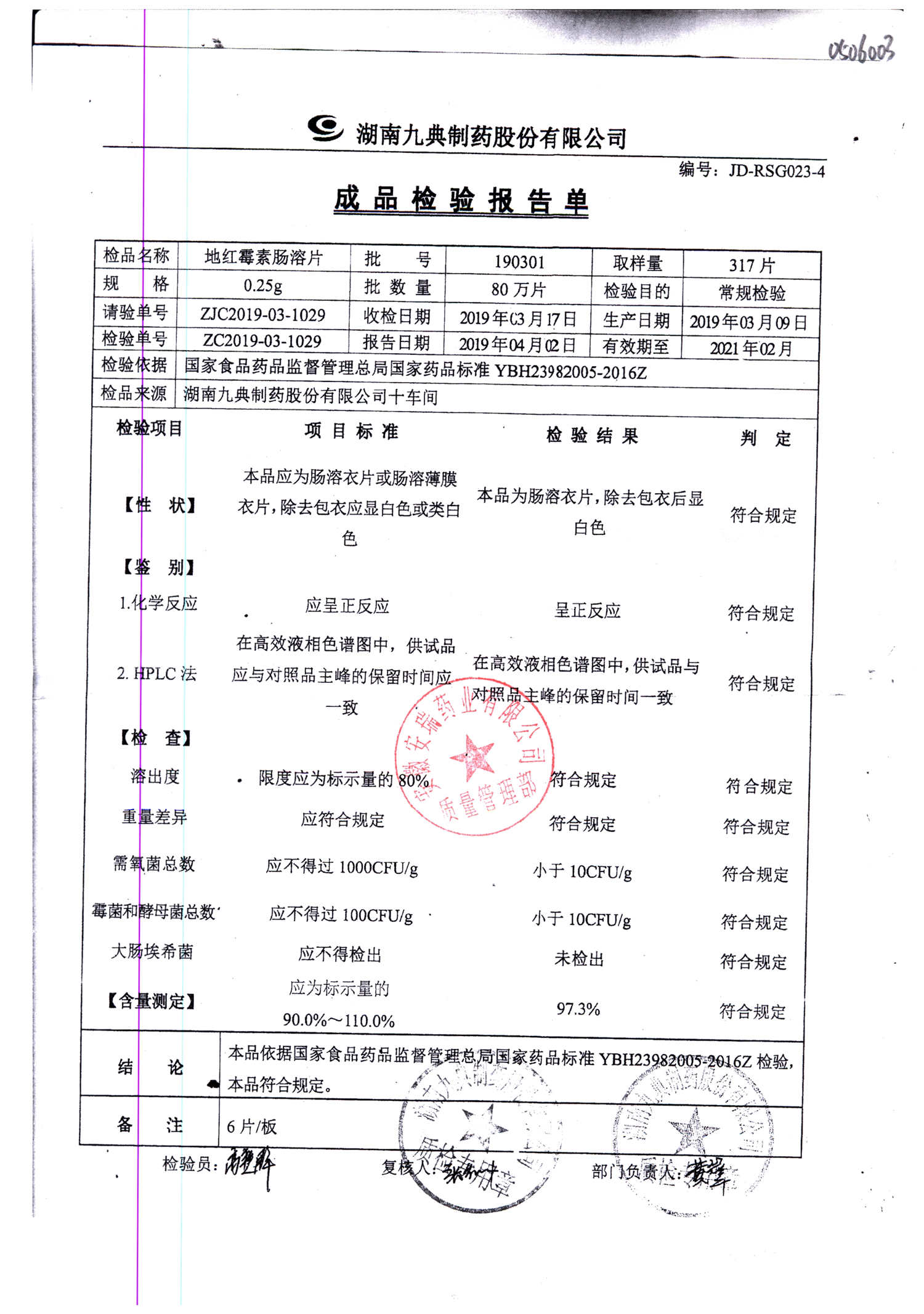 地紅霉素腸溶片 0.25g 190301 查看詳情