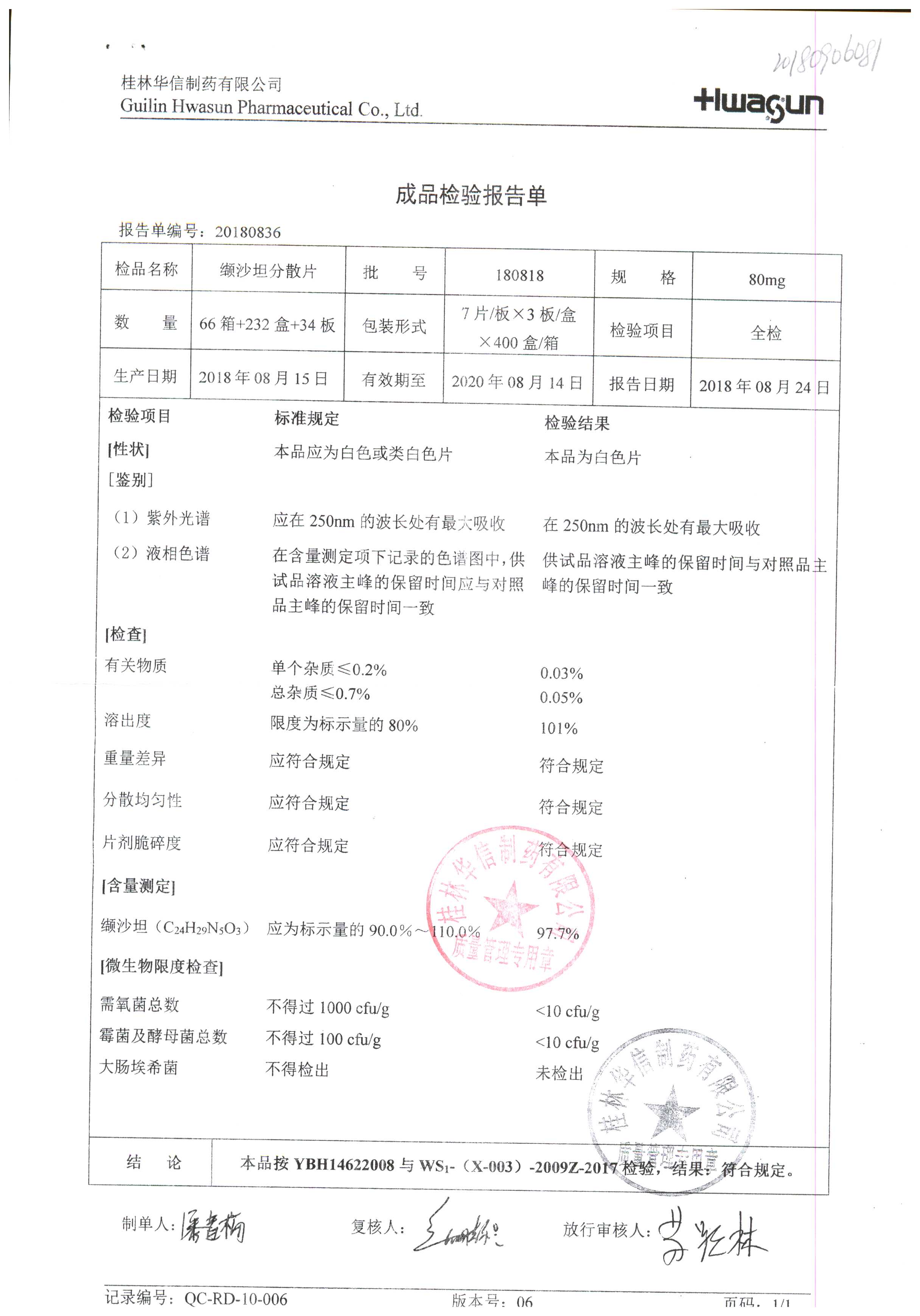| 纈沙坦分散片 | 21s | 180818 | 查看詳情 |