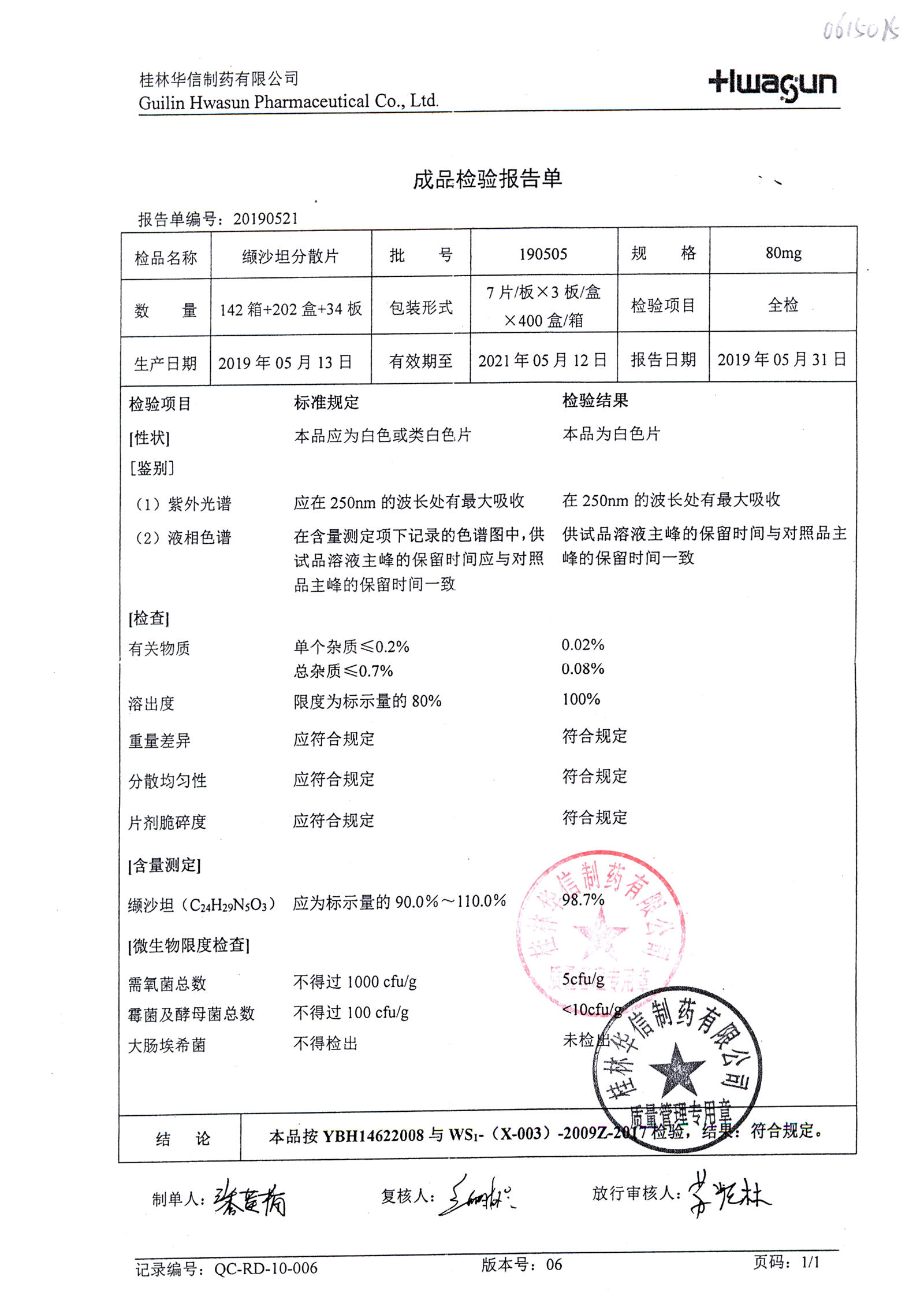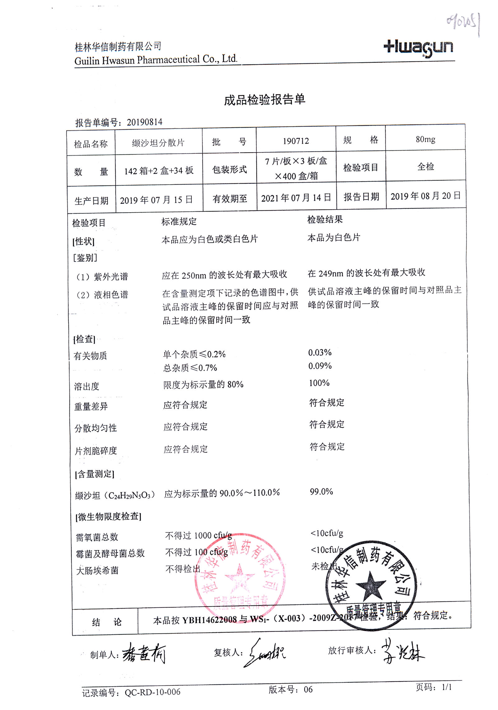 | 纈沙坦分散片 | 21s | 190505 | 查看詳情 |