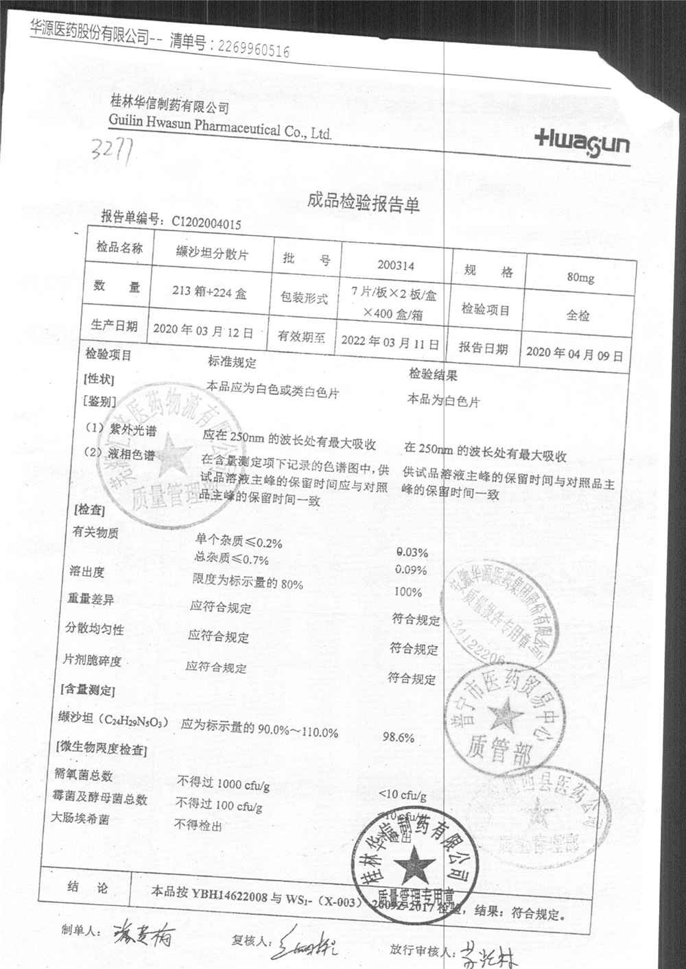 | 纈沙坦分散片 | 21s | 190303 | 查看詳情 |